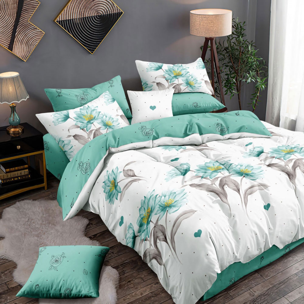 Lenjerie pentru pat dublu, cu 6 piese confectionate din 100% bumbac, tesatura tip finet. Materialul din care este confectionata lenjeria este de calitate superioara cu o textura fina, moale, foarte placuta la atingere si tratat antisifonare. Garantat nu se decoloreaza daca se respecta instructiunile de intretinere.
