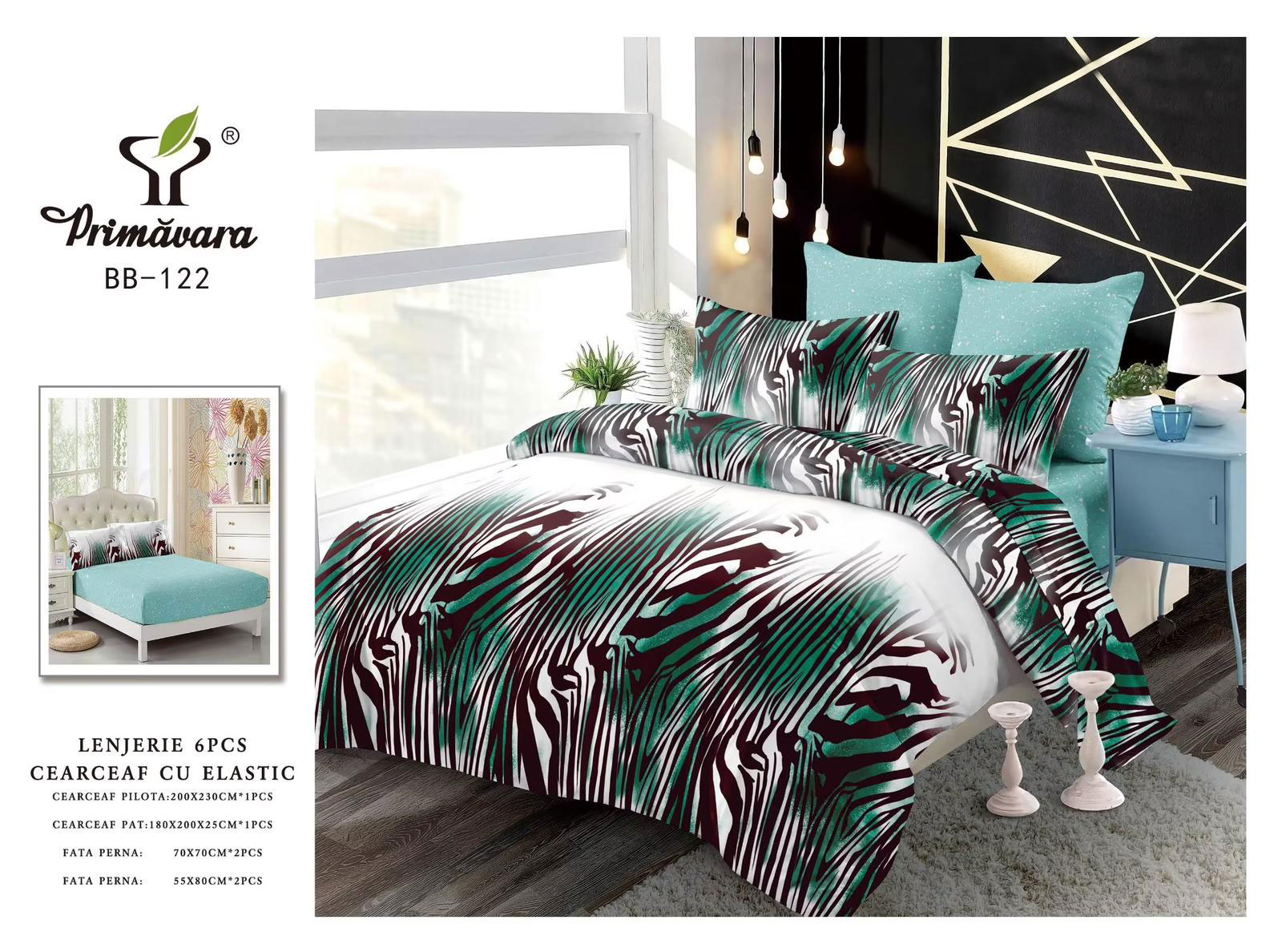 Lenjerie de pat cu 6 piese din bumbac 100%, tesatura FINET. Finet-ul este o tesatura care este tratata antisifonare, de o calitate superioara, cu o textura fina, usor pufoasa, moale si care permite pielii sa respire, pastrand temperatura corpului optima pe parcursul noptii.