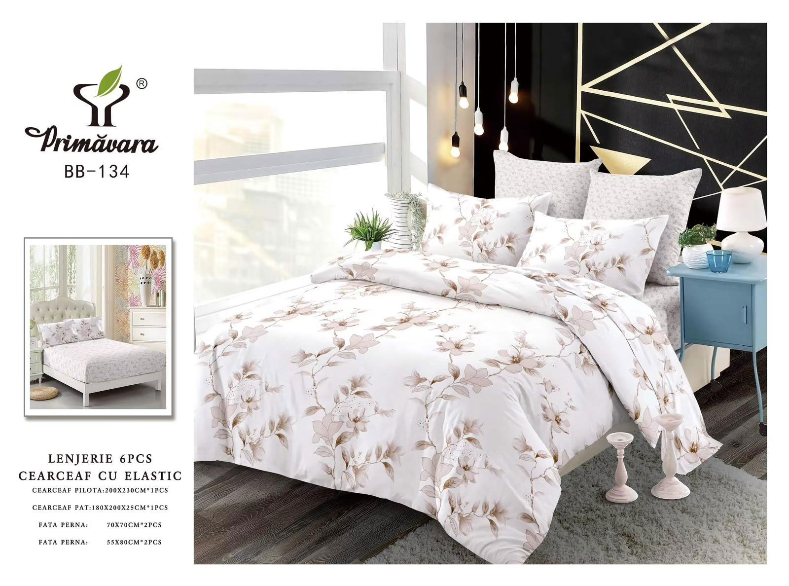 Lenjerie de pat cu 6 piese din bumbac 100%, tesatura FINET. Finet-ul este o tesatura care este tratata antisifonare, de o calitate superioara, cu o textura fina, usor pufoasa, moale si care permite pielii sa respire, pastrand temperatura corpului optima pe parcursul noptii.
