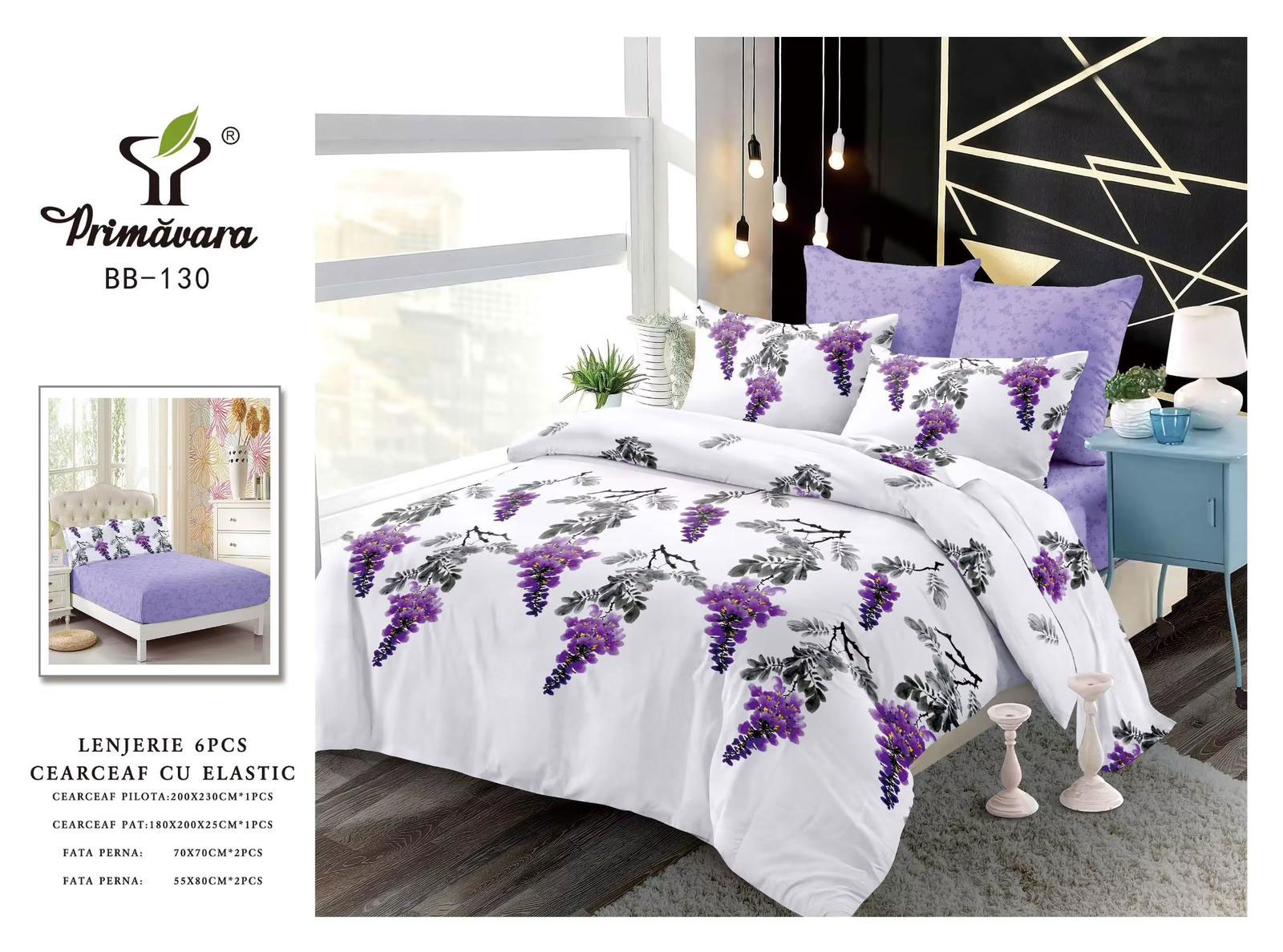 Lenjerie de pat cu 6 piese din bumbac 100%, tesatura FINET. Finet-ul este o tesatura care este tratata antisifonare, de o calitate superioara, cu o textura fina, usor pufoasa, moale si care permite pielii sa respire, pastrand temperatura corpului optima pe parcursul noptii.