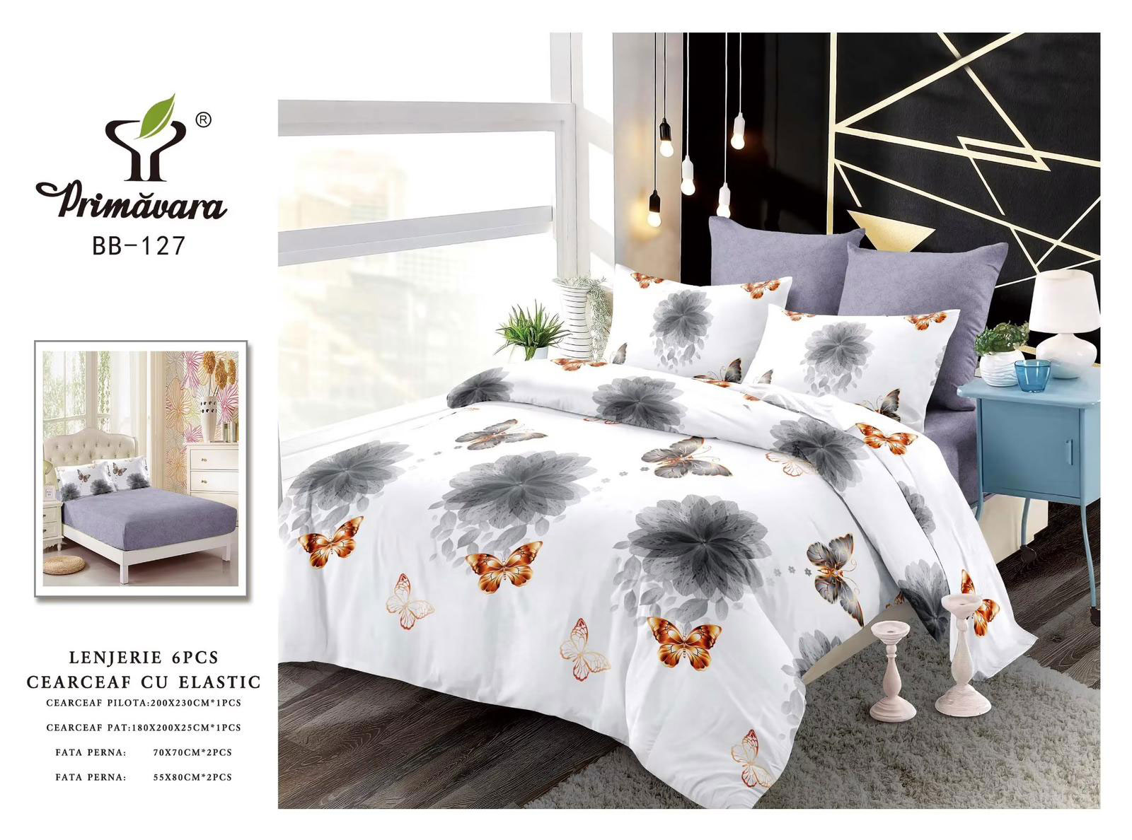 Lenjerie de pat cu 6 piese din bumbac 100%, tesatura FINET. Finet-ul este o tesatura care este tratata antisifonare, de o calitate superioara, cu o textura fina, usor pufoasa, moale si care permite pielii sa respire, pastrand temperatura corpului optima pe parcursul noptii.
