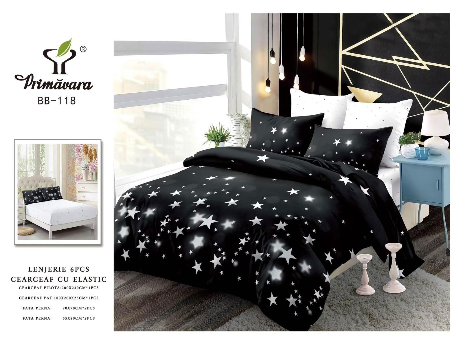 Lenjerie de pat cu 6 piese din bumbac 100%, tesatura FINET. Finet-ul este o tesatura care este tratata antisifonare, de o calitate superioara, cu o textura fina, usor pufoasa, moale si care permite pielii sa respire, pastrand temperatura corpului optima pe parcursul noptii.