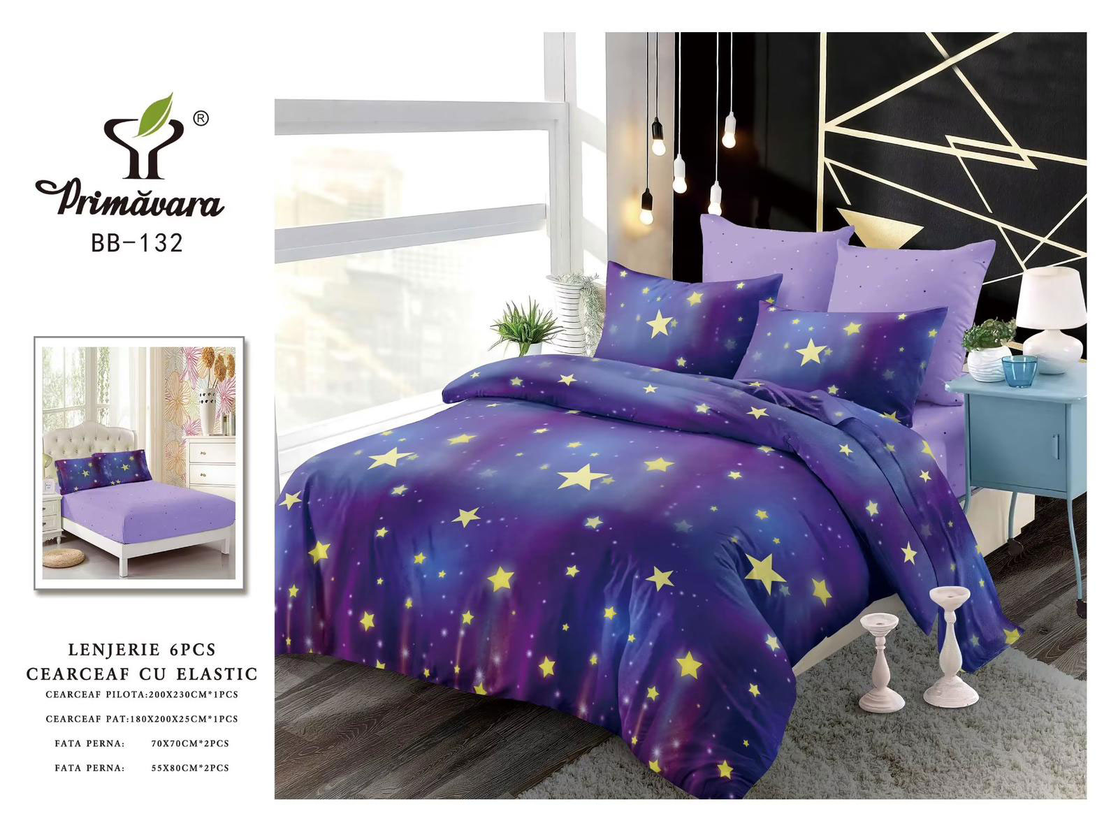 Lenjerie de pat cu 6 piese din bumbac 100%, tesatura FINET. Finet-ul este o tesatura care este tratata antisifonare, de o calitate superioara, cu o textura fina, usor pufoasa, moale si care permite pielii sa respire, pastrand temperatura corpului optima pe parcursul noptii.