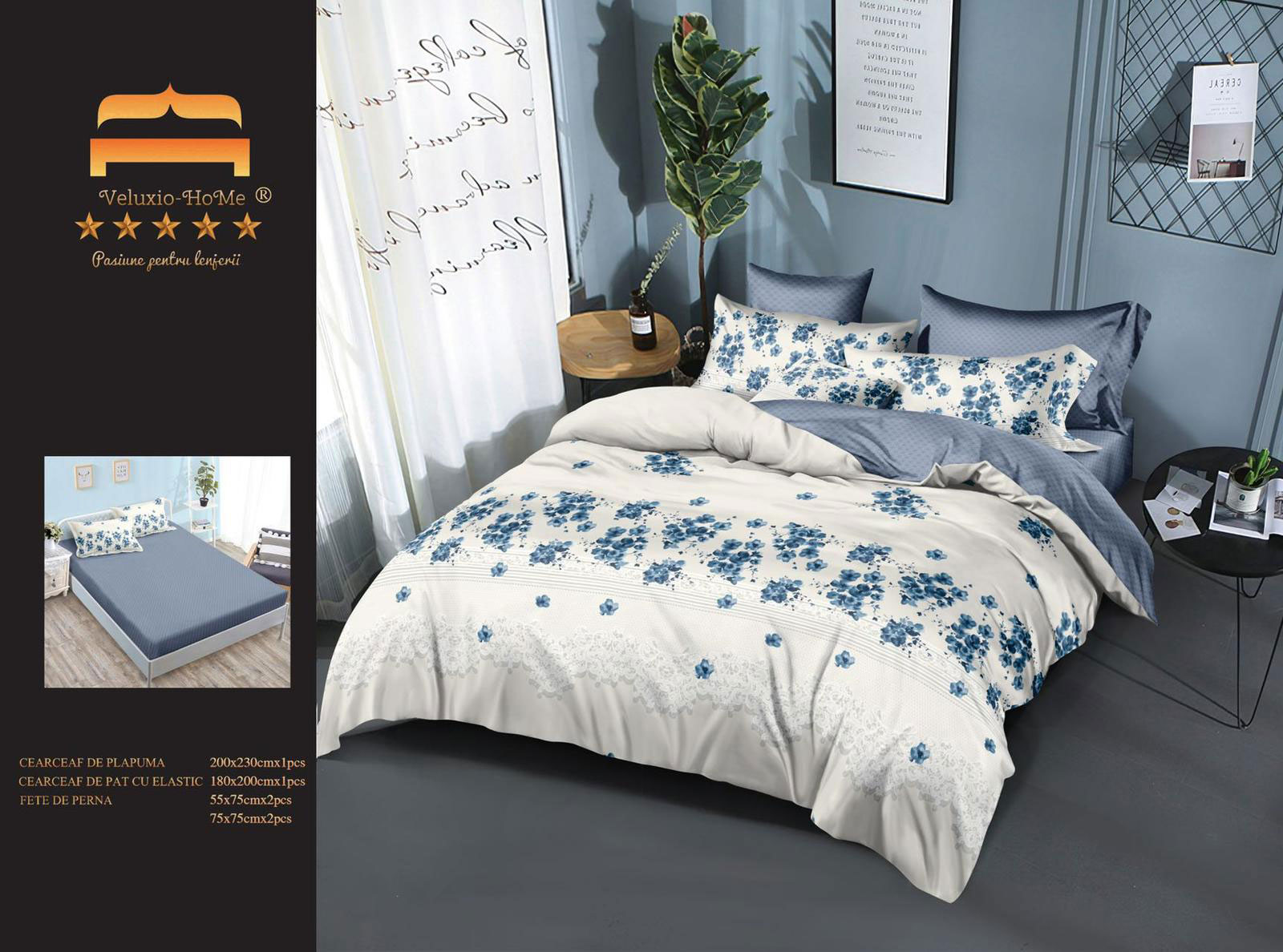 Lenjerie de pat cu 6 piese din bumbac 100%, tesatura FINET. Finet-ul este o tesatura care este tratata antisifonare, de o calitate superioara, cu o textura fina, usor pufoasa, moale si care permite pielii sa respire, pastrand temperatura corpului optima pe parcursul noptii.