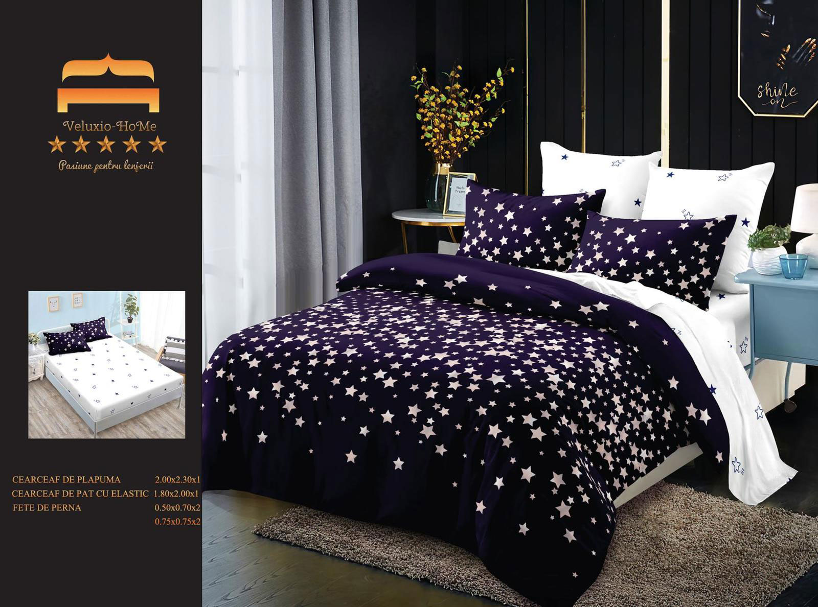 Lenjerie de pat cu 6 piese din bumbac 100%, tesatura FINET. Finet-ul este o tesatura care este tratata antisifonare, de o calitate superioara, cu o textura fina, usor pufoasa, moale si care permite pielii sa respire, pastrand temperatura corpului optima pe parcursul noptii.