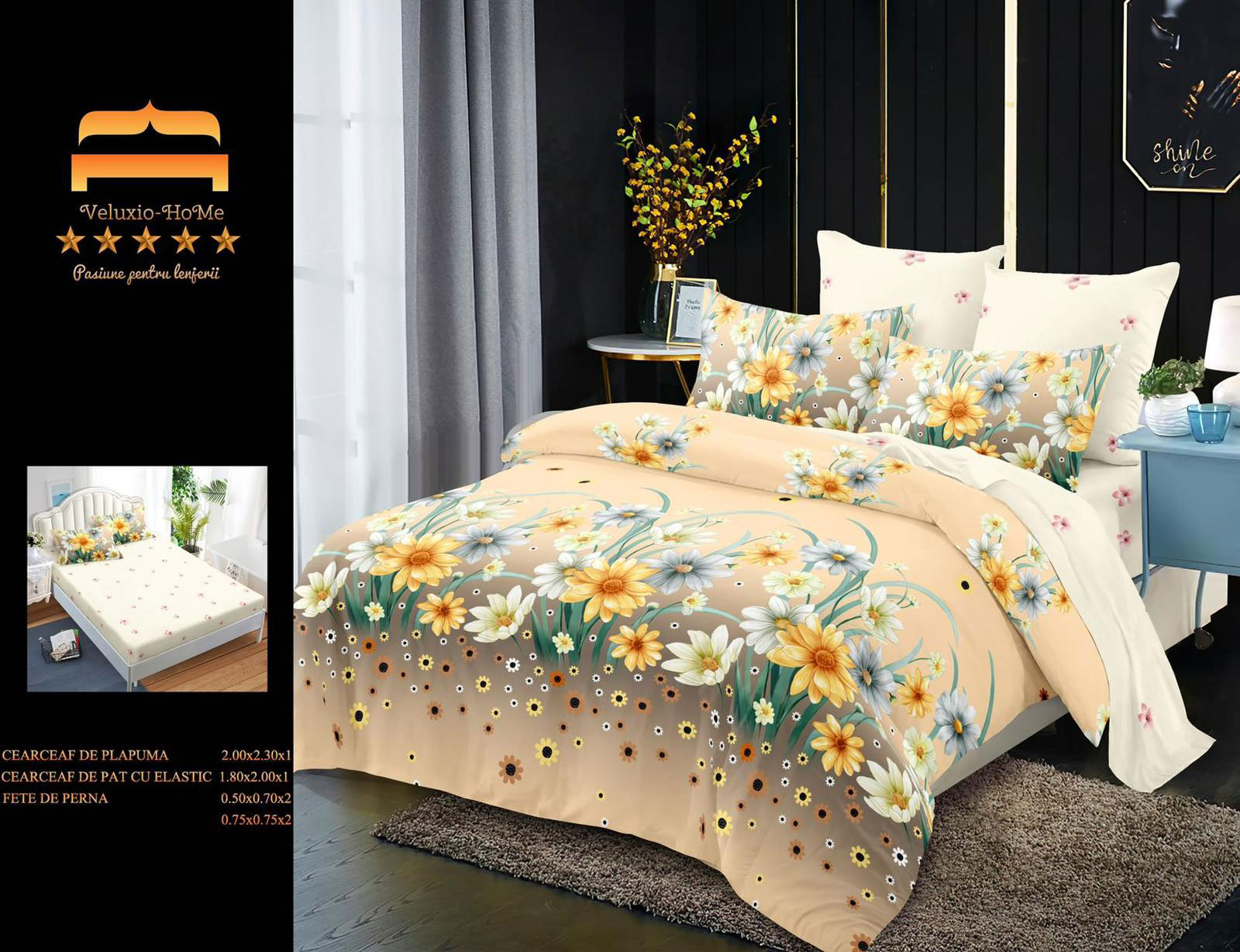 Lenjerie de pat cu 6 piese din bumbac 100%, tesatura FINET. Finet-ul este o tesatura care este tratata antisifonare, de o calitate superioara, cu o textura fina, usor pufoasa, moale si care permite pielii sa respire, pastrand temperatura corpului optima pe parcursul noptii.
