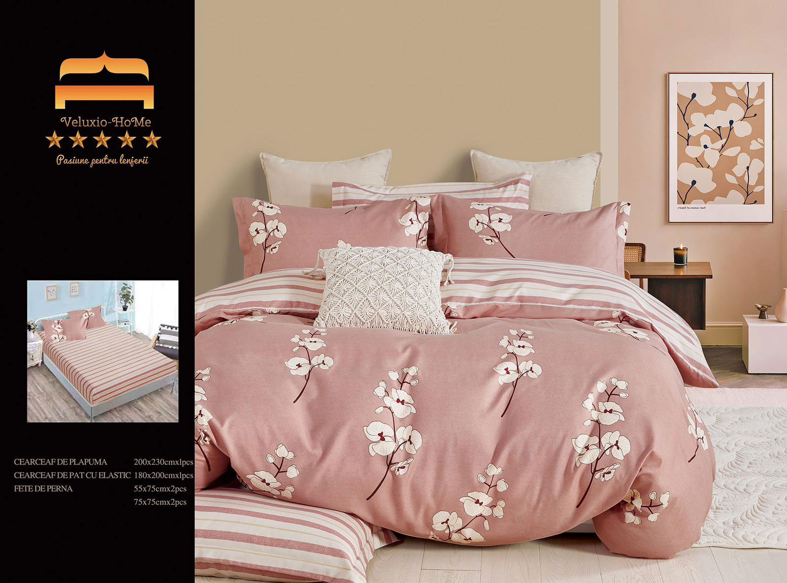 Lenjerie de pat cu 6 piese din bumbac 100%, tesatura FINET. Finet-ul este o tesatura care este tratata antisifonare, de o calitate superioara, cu o textura fina, usor pufoasa, moale si care permite pielii sa respire, pastrand temperatura corpului optima pe parcursul noptii.