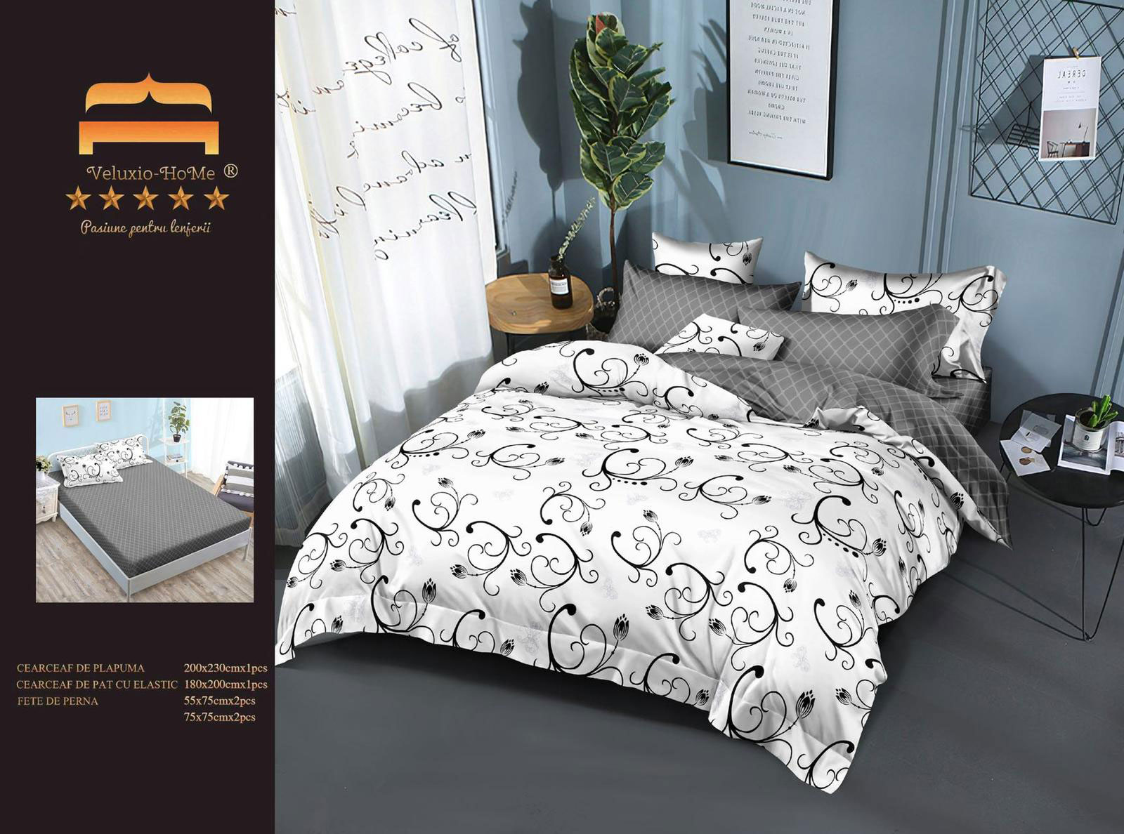 Lenjerie de pat cu 6 piese din bumbac 100%, tesatura FINET. Finet-ul este o tesatura care este tratata antisifonare, de o calitate superioara, cu o textura fina, usor pufoasa, moale si care permite pielii sa respire, pastrand temperatura corpului optima pe parcursul noptii.