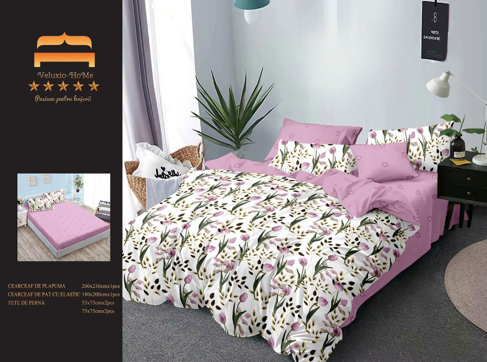 Lenjerie de pat cu 6 piese din bumbac 100%, tesatura FINET. Finet-ul este o tesatura care este tratata antisifonare, de o calitate superioara, cu o textura fina, usor pufoasa, moale si care permite pielii sa respire, pastrand temperatura corpului optima pe parcursul noptii.