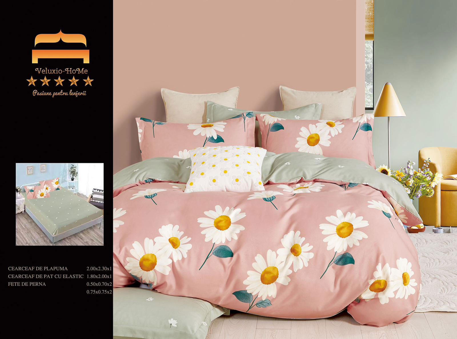 Lenjerie de pat cu 6 piese din bumbac 100%, tesatura FINET. Finet-ul este o tesatura care este tratata antisifonare, de o calitate superioara, cu o textura fina, usor pufoasa, moale si care permite pielii sa respire, pastrand temperatura corpului optima pe parcursul noptii.