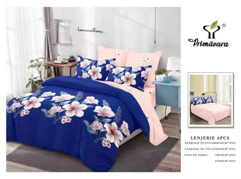Lenjerie pentru pat dublu, cu 6 piese confectionate din 100% bumbac, tesatura tip finet. Materialul din care este confectionata lenjeria este de calitate superioara cu o textura fina, moale, foarte placuta la atingere si tratat antisifonare. Garantat nu se decoloreaza daca se respecta instructiunile de intretinere.