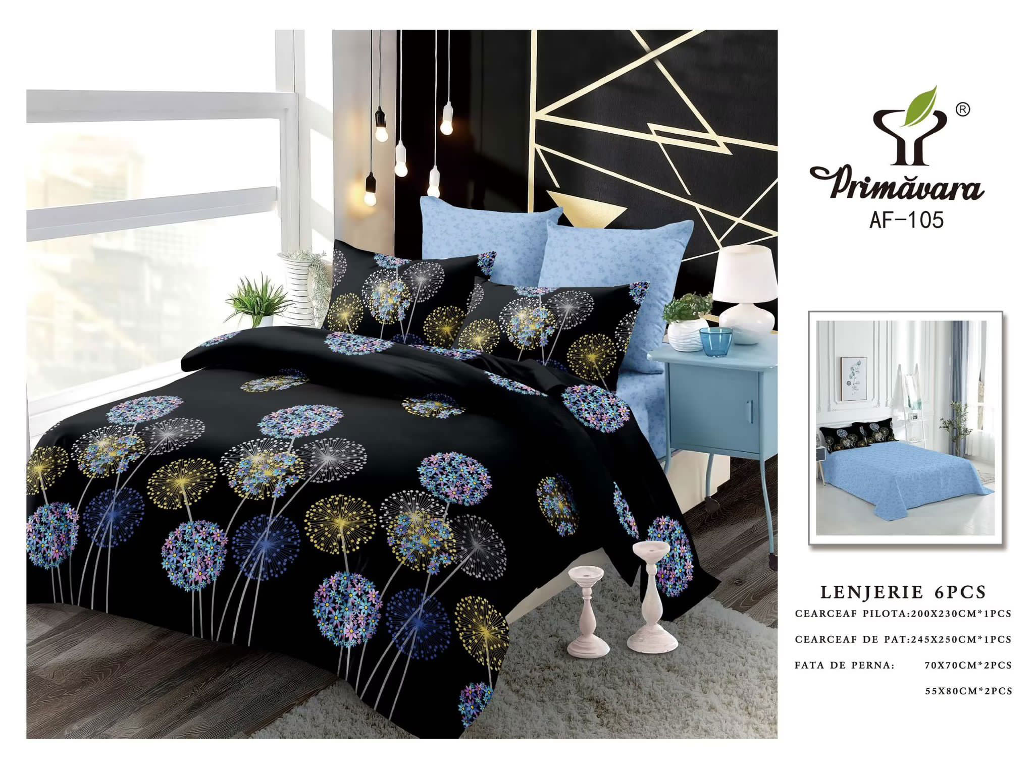 Lenjerie pentru pat dublu, cu 6 piese confectionate din 100% bumbac, tesatura tip finet. Materialul din care este confectionata lenjeria este de calitate superioara cu o textura fina, moale, foarte placuta la atingere si tratat antisifonare. Garantat nu se decoloreaza daca se respecta instructiunile de intretinere.