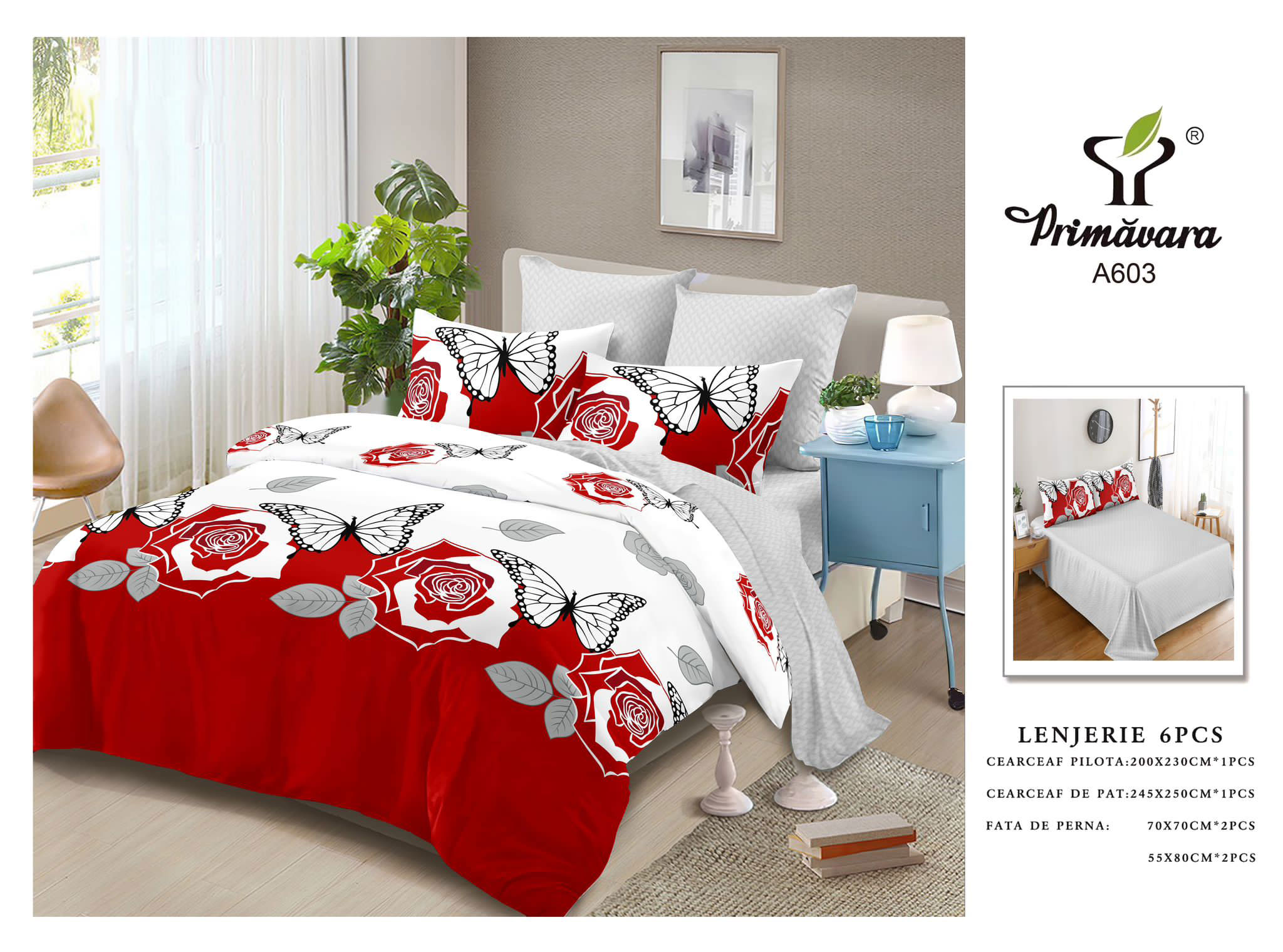 Lenjerie pentru pat dublu, cu 6 piese confectionate din 100% bumbac, tesatura tip finet. Materialul din care este confectionata lenjeria este de calitate superioara cu o textura fina, moale, foarte placuta la atingere si tratat antisifonare. Garantat nu se decoloreaza daca se respecta instructiunile de intretinere.