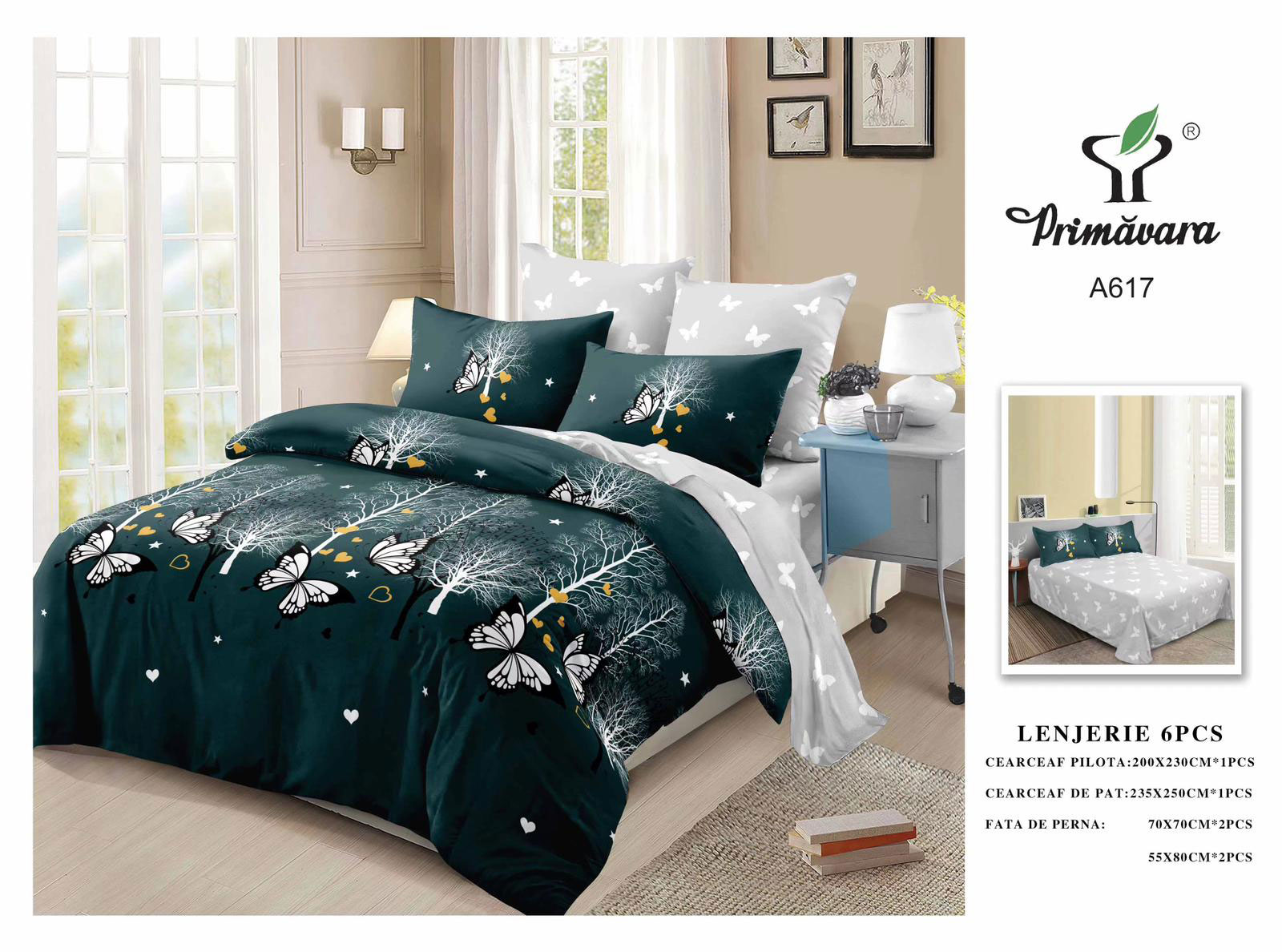 Lenjerie pentru pat dublu, cu 6 piese confectionate din 100% bumbac, tesatura tip finet. Materialul din care este confectionata lenjeria este de calitate superioara cu o textura fina, moale, foarte placuta la atingere si tratat antisifonare. Garantat nu se decoloreaza daca se respecta instructiunile de intretinere.