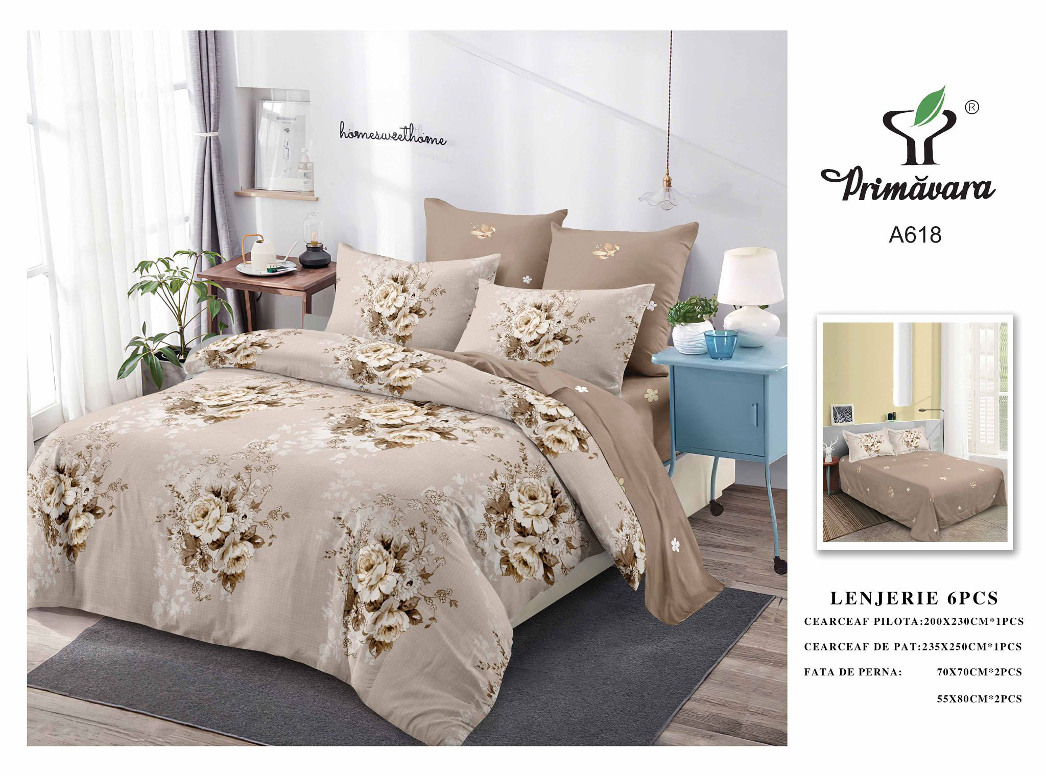 Lenjerie pentru pat dublu, cu 6 piese confectionate din 100% bumbac, tesatura tip finet. Materialul din care este confectionata lenjeria este de calitate superioara cu o textura fina, moale, foarte placuta la atingere si tratat antisifonare. Garantat nu se decoloreaza daca se respecta instructiunile de intretinere.