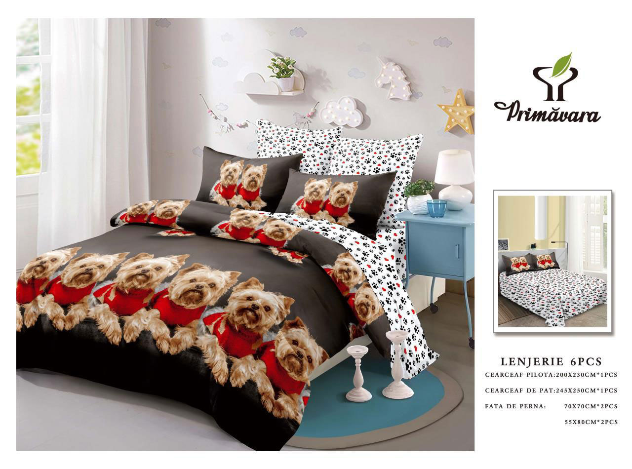 Lenjerie pentru pat dublu, cu 6 piese confectionate din 100% bumbac, tesatura tip finet. Materialul din care este confectionata lenjeria este de calitate superioara cu o textura fina, moale, foarte placuta la atingere si tratat antisifonare. Garantat nu se decoloreaza daca se respecta instructiunile de intretinere.