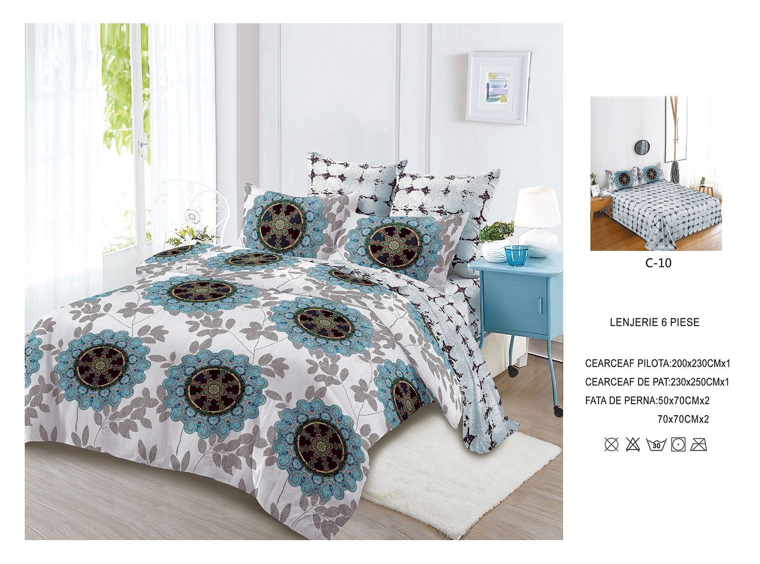 Lenjerie pentru pat dublu, cu 6 piese confectionate din 100% bumbac, tesatura tip finet. Materialul din care este confectionata lenjeria este de calitate superioara cu o textura fina, moale, foarte placuta la atingere si tratat antisifonare. Garantat nu se decoloreaza daca se respecta instructiunile de intretinere.