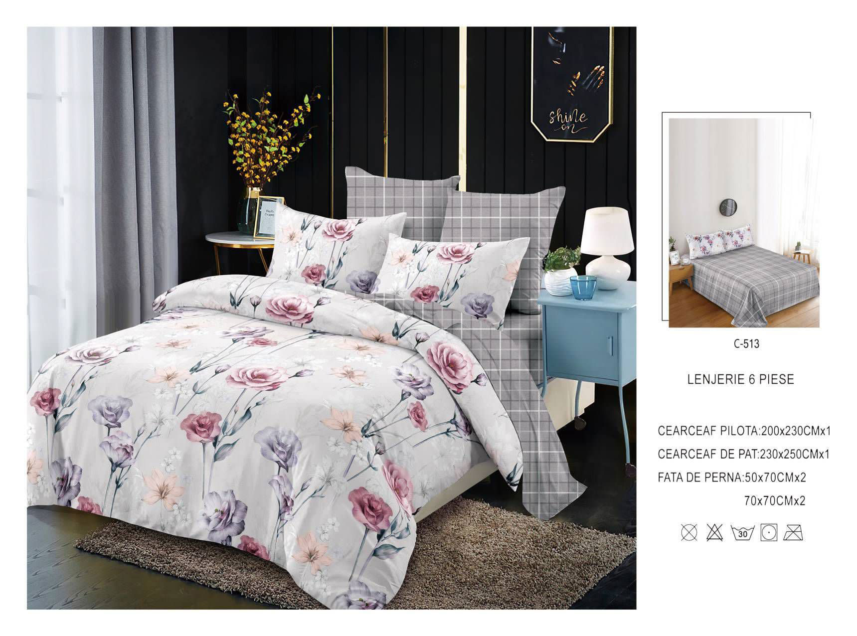 Lenjerie pentru pat dublu, cu 6 piese confectionate din 100% bumbac, tesatura tip finet. Materialul din care este confectionata lenjeria este de calitate superioara cu o textura fina, moale, foarte placuta la atingere si tratat antisifonare. Garantat nu se decoloreaza daca se respecta instructiunile de intretinere.