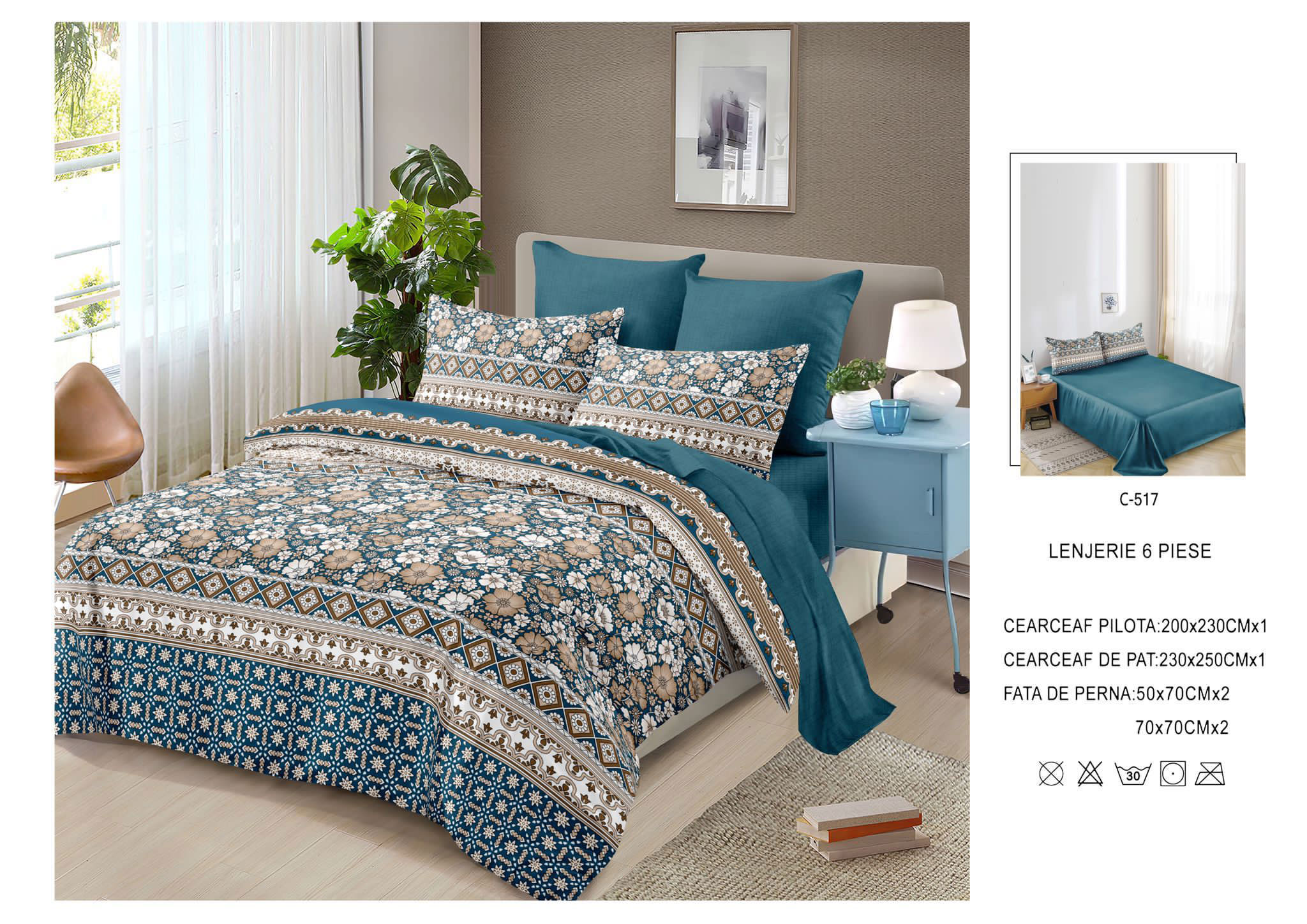 Lenjerie pentru pat dublu, cu 6 piese confectionate din 100% bumbac, tesatura tip finet. Materialul din care este confectionata lenjeria este de calitate superioara cu o textura fina, moale, foarte placuta la atingere si tratat antisifonare. Garantat nu se decoloreaza daca se respecta instructiunile de intretinere.